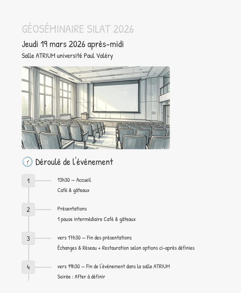 Cette année, le programme du Géoséminaire prend une dimension toute particulière : il est entièrement conçu et présenté par les étudiant·es du Mastère Spécialisé SILAT. À travers une programmation riche et engagée, ils et elles partageront leurs regards, leurs questionnements et leurs expériences autour des liens entre géomatique et solidarité internationale. Conférences, ateliers et temps d’échanges rythmeront ces journées pour offrir un espace vivant de réflexion et de dialogue, où la créativité étudiante rencontre les enjeux concrets des territoires et de l’action solidaire.